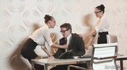 Офисный перерыв превращается в ЖМЖ с боссом. Две помощницы раздвигают ноги, а он вгоняет ствол в их киски на столе. Телочки стонут, принимая его с напором в разных позах. Оргазмы накрывают их, сжимая пилотки. Они кричат, наслаждаясь жарким трахом. Босс продолжает долбить их, пока все не тонут в похотливом угаре. Офис оживает от их страсти.