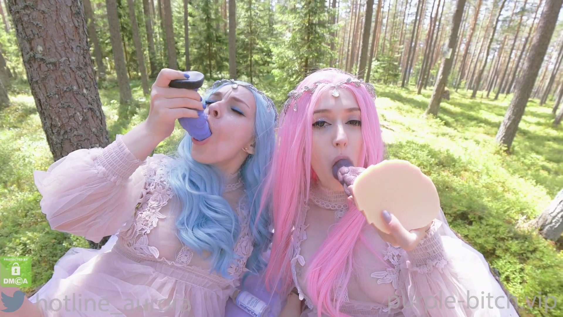 Сбежав от соседей, телочки в костюмах эльфиек устроили лесбийские игры в лесу. Они ласкали языками киски, стонали и облизывали дилдо, пихая их в глотки. Крошки долбили вагины и попки игрушками, кричали от кайфа и бурно кончили с кремпаем. Они легли на траву, напевая, довольные уединённым оргазмом.