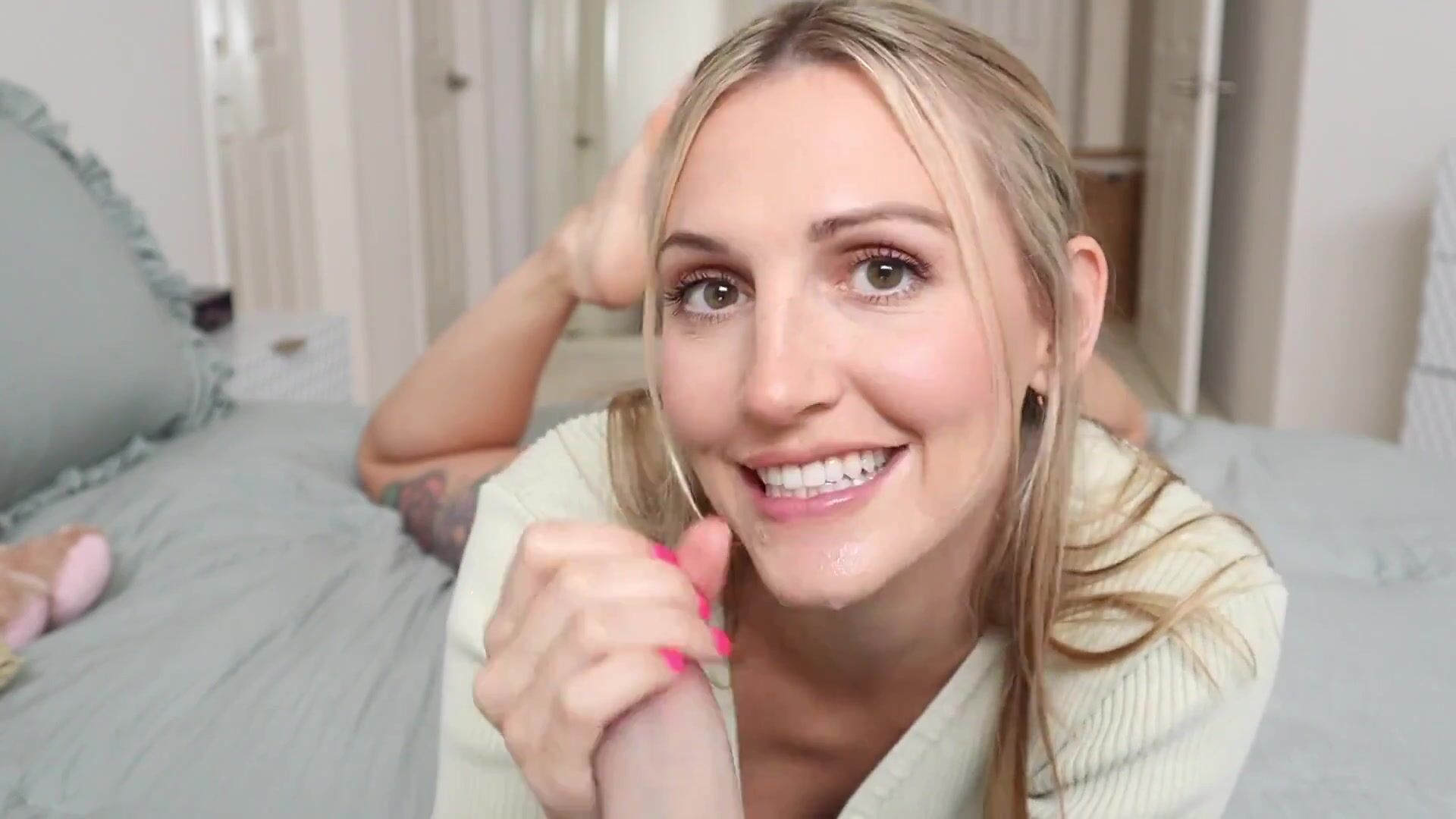 Беленькая развратница с шикарным телом постепенно разделась догола и продемонстрировала прелести перед камерой. Сексапильная блондинка показала сиськи и сочную попку, а потом начала облизывать резиновый дилдо. После этого цыпочка засунула искусственный член во влажную вагину и облила себя горячей спермой в завершении.