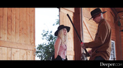 Jazlyn Ray с шикарной задницей соблазнила лысого и татуированного ковбоя и напросилась на страстный секс на сеновале. Сначала малышка в откровенном наряде получила член за щеку и смочила его слюнями по всем правилам. После этого беленькая штучка отдалась в вагину и громко стонала, пока не получила оргазм и сперму на лицо.