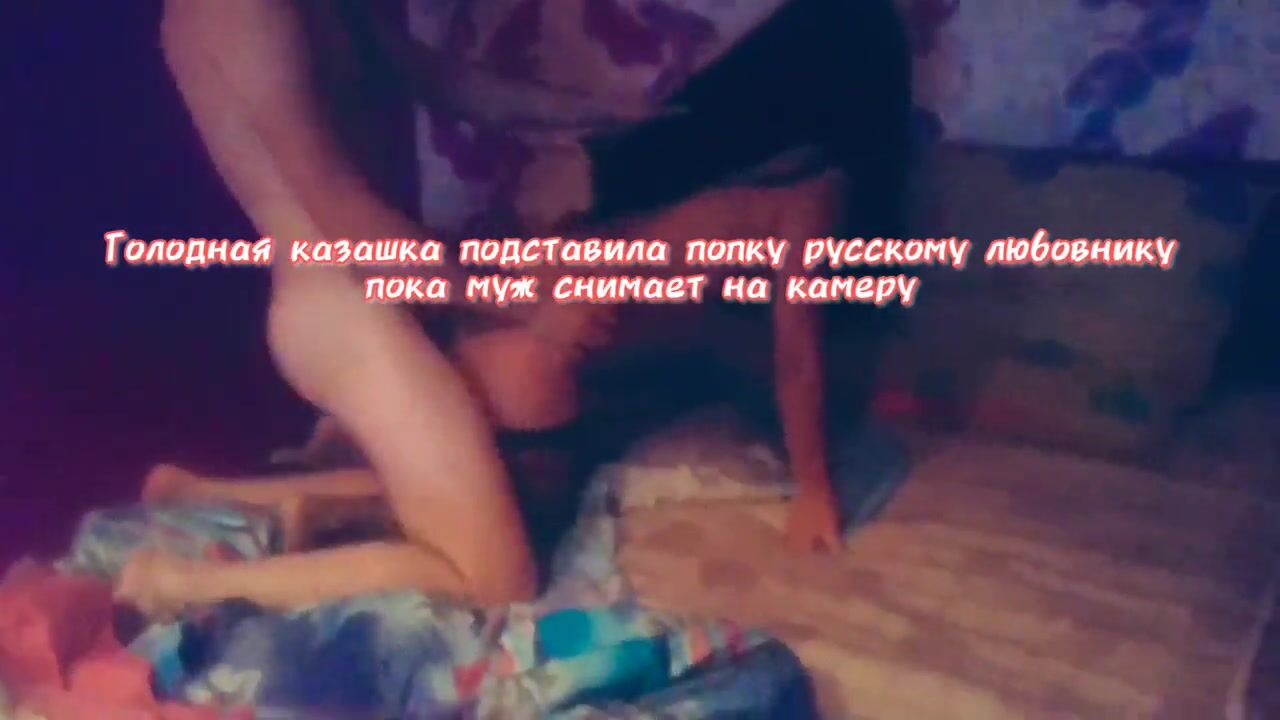 Казахская парочка позвала своего русского приятеля в гости. Пока парень трахает женатую тетку в зад, ее покорный муж рогоносец снимает все на камеру.