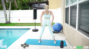 Беленькая штучка в обтягивающих лосинах демонстрировала прелести и дразнила личного тренера, пока не возбудила его дальше некуда. Тогда развратница Kay Lovely стянула лосины и дала вылизать мокрую пилотку до блеска, а в ответ отсосала член. После этого сексапильная блондиночка отдалась в вагину и трахалась без остановки, пока не кончила.