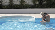 Нежная блондиночка сняла купальник и легко возбудила парня. Силиконовая штучка организовала страстный секс прямо в бассейне и сразу начала работать ртом. Когда милашка насладилась ответным кунилингусом, она отдалась во влажную щелку и громко стонала, пока не достигла долгожданного и яркого финала прямо на свежем воздухе.