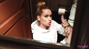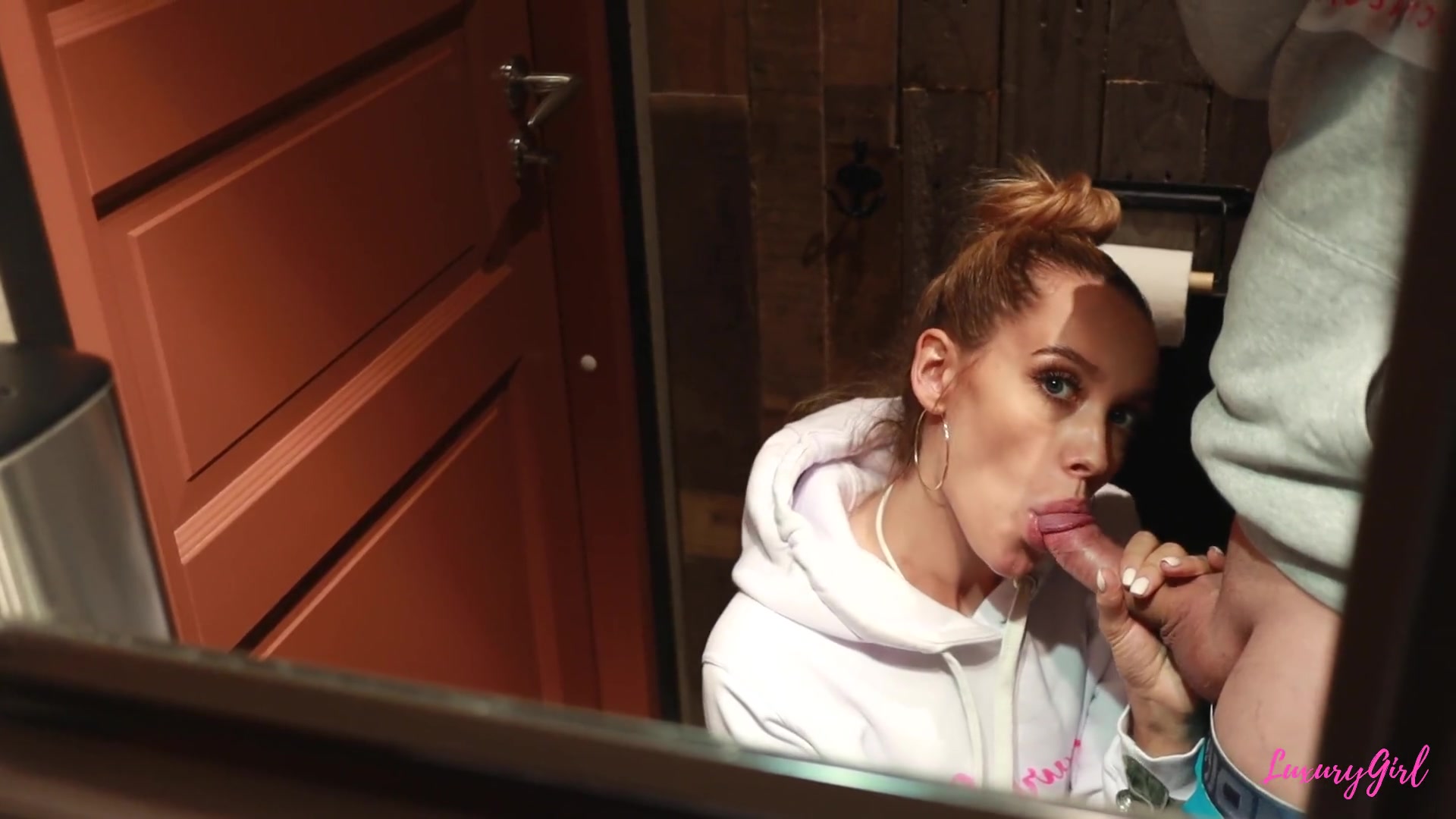 В кафе милашка затащила парня в туалет, не боясь спалиться. Она встала на колени, заглатывала его член по гланды, хлюпая слюнями. Сучка хрипела, пихая ствол в глотку, пока сперма не хлынула в рот. Оргазм накрыл её от возбуждения. Крошка слизала остатки, вытерла лицо и легла на раковину, ловя кайф.