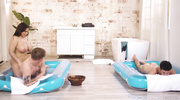 Вместо того, чтобы действительно порадовать парней массажем, опытная красотка устроила жаркий тройничок. Милфа показала большие сиськи и облила себя маслом. Опытная дамочка продемонстрировала прелести и сразу начала сосать члены, а когда вошла во вкус, выпросила трах в мокрую и узкую пилотку по самую матку.