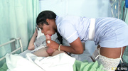 Застукав пациента с каменным стояком, жопастая негритянка в форме медсестры не удержалась и начала жадно отсасывать белый член. Она заглатывала ствол глубоко, облизывая по всей длине, а затем оседлала парня влажной пилоткой. Сучка скакала, виляя попкой, и дала оттрахать себя раком, пока не кончила бурно. В финале она стонала, принимая сперму на бритый лобок.