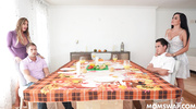 Милфы с большими и искусственными сиськами показали прелести и возбудили пасынков друг друга. Красотки организовали групповой секс и тут же принялись сосать члены. Когда сами ненасытные дамочки насладились ответными оральными ласками, они практически одновременно кончили от глубокого проникновения в вагины.