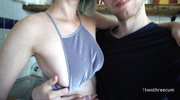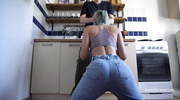 Кухонная суета оборачивается похотью для девчонки в джинсах. Флиртуя с парнем, она опускается на колени, лаская его ствол языком через ткань. Губы жадно впиваются в член, пока слюна смачивает джинсы, а её стоны наполняют кухню. Она заглатывает глубже, представляя, как он кончает, и ускоряет ритм. Похотливый взгляд манит его, а руки сжимают его бёдра. Финал бьёт струёй, покрывая её губы. Развратница слизывает остатки, наслаждаясь запретным удовольствием.