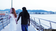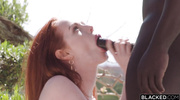 Малышка с рыжими волосами в одном лишь купальнике предстала перед черным любовником и возбудила его, особо не стараясь. Элла Хьюз сразу встала на колени и прямо на улице умело отсосала член. После чувственного и ответного кунилингуса гламурная модель подставила пилотку под член и кайфовала, пока не кончила.
