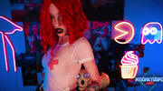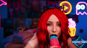 Модель с шикарным телом включила камеру и стала позировать перед ней, чтобы порадовать фанатов. Рыженькая штучка показала силиконовые сиськи и сочную попку, а потом начала мастурбировать розовую киску. Немного порадовав себя пальчиками, косплейщица начала облизывать резиновый дилдо, который потом и оседлала.