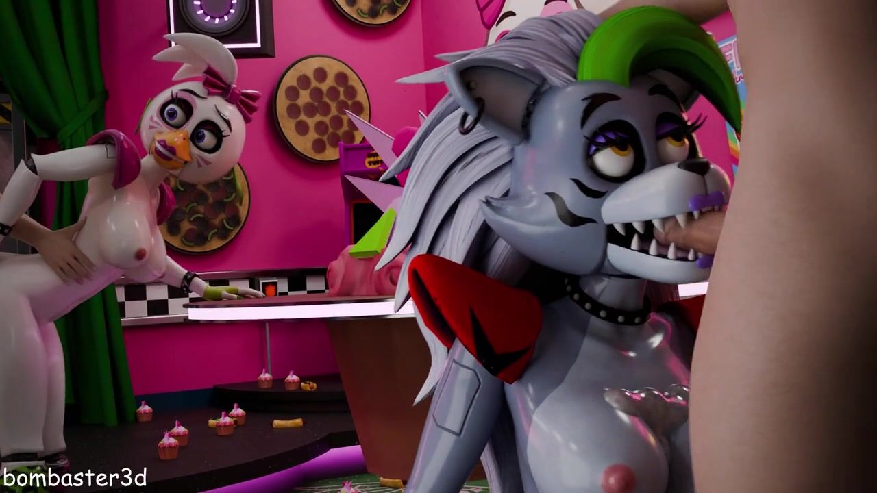 ФНаФ секс афтерпати с Чика и Рокси. Шумная порно вечеринка с аниматрониками, пока Чику натягивают стоя раком Рокси накончали целый рот спермы.