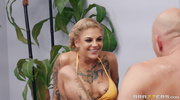 Соблазнительная блонди с дерзкими тату встречает лысого клиента на приватном сеансе. Её нежные руки скользят по его телу, а страсть разгорается с каждым движением. Она жадно балует его твёрдый член глубоким минетом, не скрывая своего желания. Вскоре её влажная киска принимает его мощный ствол — он жёстко проникает в неё прямо на столе, доводя до бурного оргазма. Финал — густой поток спермы на её алчное личико и в ротик. Не пропусти этот откровенный массаж, где каждый миг наполнен похотью и наслаждением!