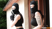 Две сексапильные красотки в масках забрались в дом богача, но во время воровства были пойманы на месте преступления. Воровки напросились на групповую долбежку с ментами, чтобы не попасть за решетку. Красотки с удовольствием отсосали члены, а после этого дали оттрахать и пилотки, и тугие анальные дырочки, причем двойным проникновением.